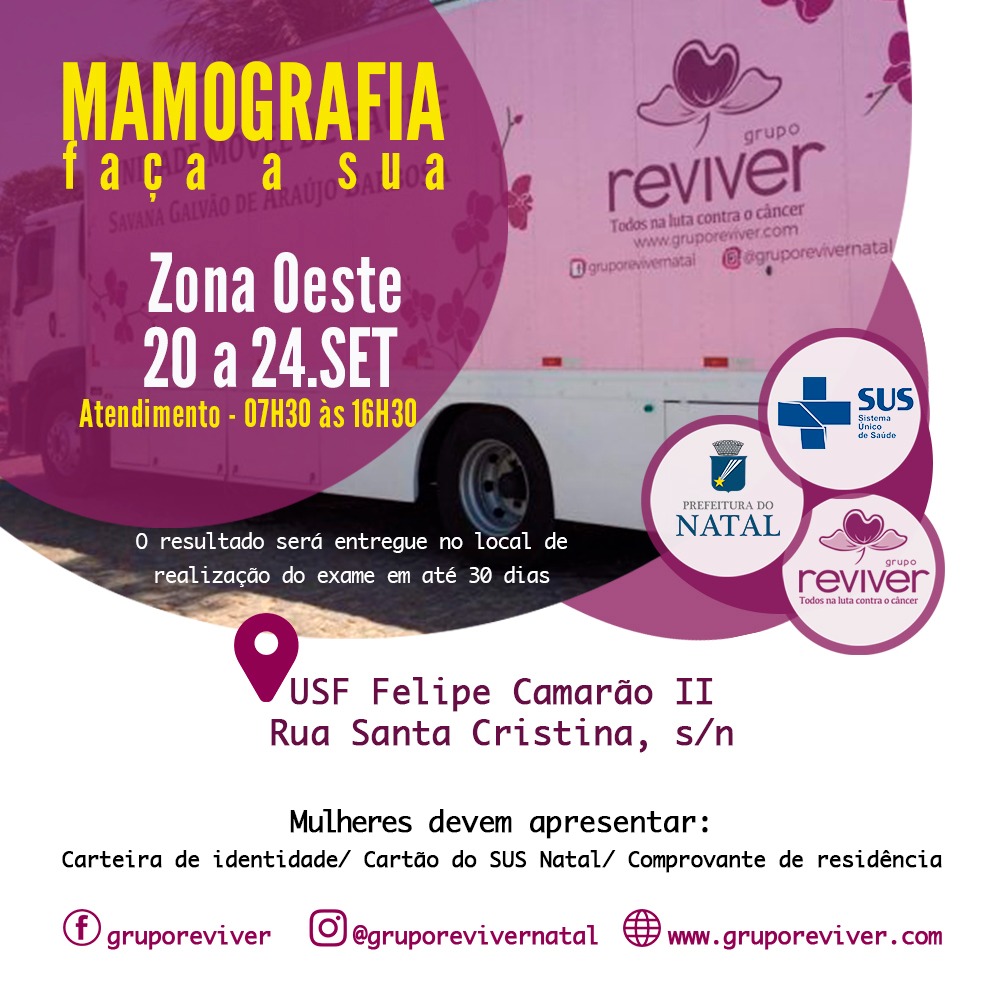 Dando seguimento ao calendário permanente de mamografias, a unidade móvel do Grupo Reviver estará na USF Felipe Camarão II, Rua Santa Cristina, s/n, das 7h30 às 16h30. As mulheres de 40 a 70 anos devem levar RG, cartão SUS e comprovante de endereço de Natal. As fichas são distribuídas diariamente sempre no início do expediente, para atendimento nos turnos da manhã e da tarde.